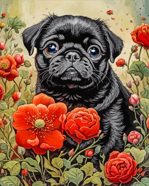 Black Pug Puppy And Flowers Diamond Painting